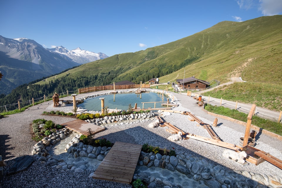 Ein großer Wasserteich kann mit einem Ziehboot, einem Spielfloß oder beim Kneippen erkundigt werden. Besonders mutige Abenteurer trauen sich auch über die knapp 9 m lange Slackline ans andere Ufer. Viele weitere Attraktionen mit Wasser und Alpentiere aus Holz versprechen riesengroßen Spaß und bringen nebenbei der ganzen Familie den Naturraum Alm mit seinen Besonderheiten näher.