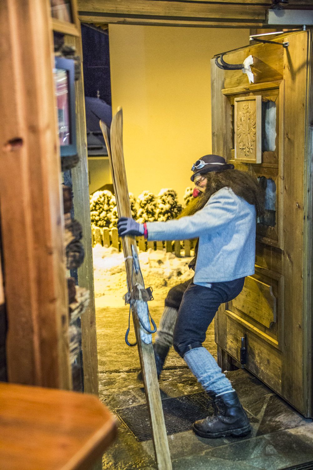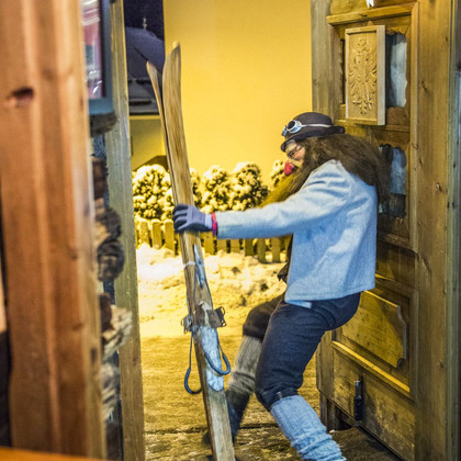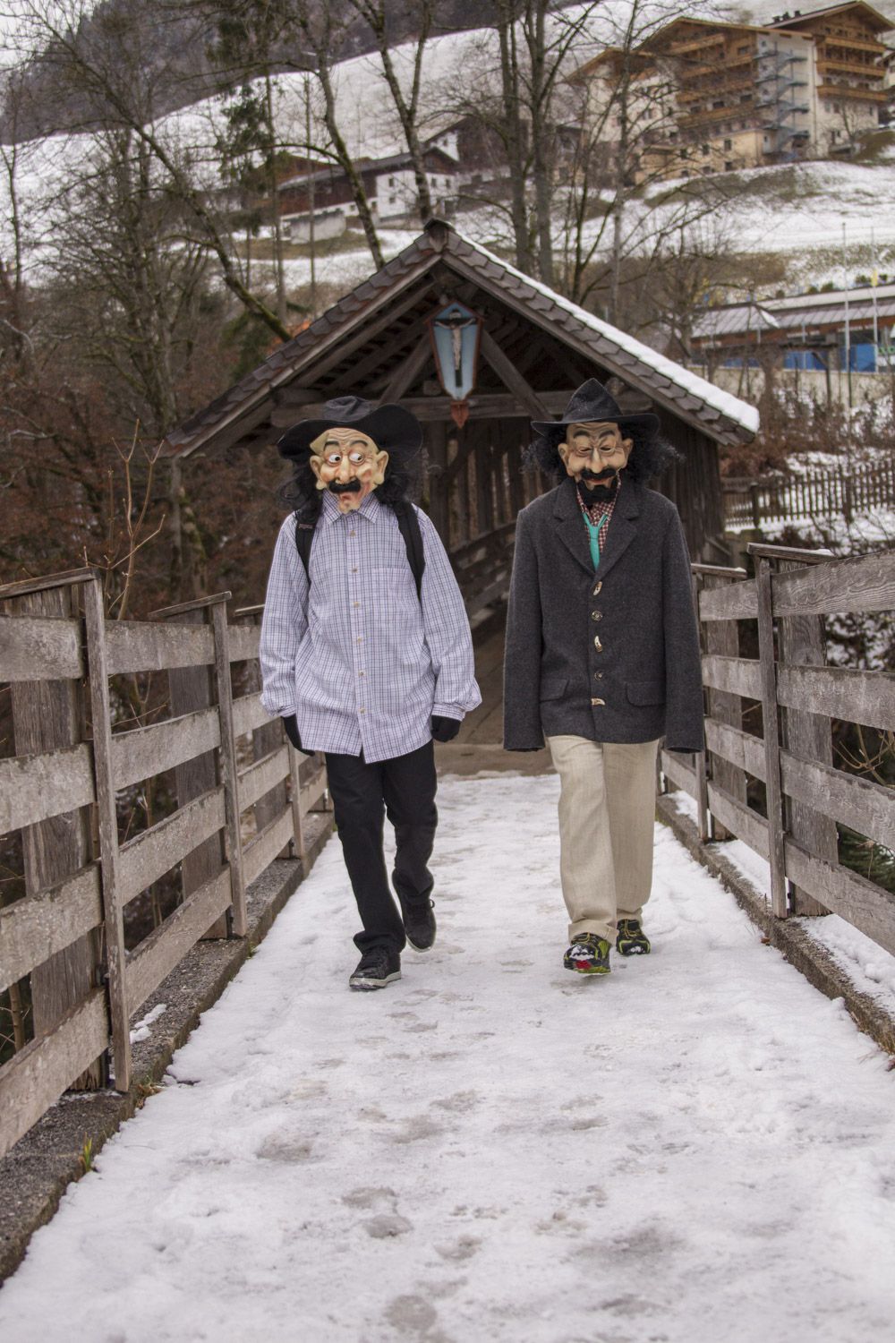 Heraus fliegen drei, ich würde sagen, noch kurioser anmutende Gestalten, eindeutig im „Luis Trenker Look“ der dreißiger Jahre. Braunes, gewalktes Wollgewand, die Kniebundhose endet in handfesten Stricksocken aus – mich fängt es bereits zu jucken an – Schurwolle! In der Hand prachtvolle Holzski mit Telemarkbindung und die Füße zieren uralte Lederschuhe mit Nägeln in den Sohlen. Auf den Köpfen ganz im Original, die Gletscherbrille von damals über dem Lodenhut. Wo bin ich hier gelandet? Es ist laut der Digitalanzeige meiner Uhr der fünfte Jänner! Also fünf Tage nach Silvester und einen Tag vor dem Heiligen-Drei-Königstag, aber wo kommt da dieser außerordentliche Fasching her, der hier im Tuxertal gerade mit Inbrunst gefeiert wird?