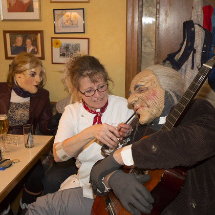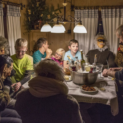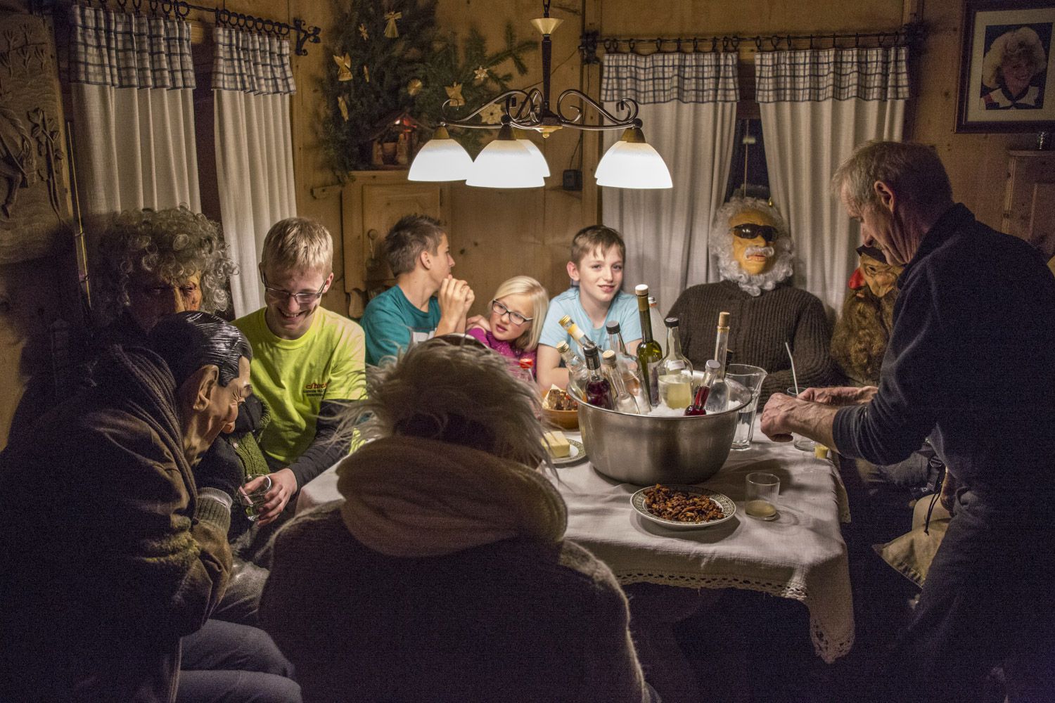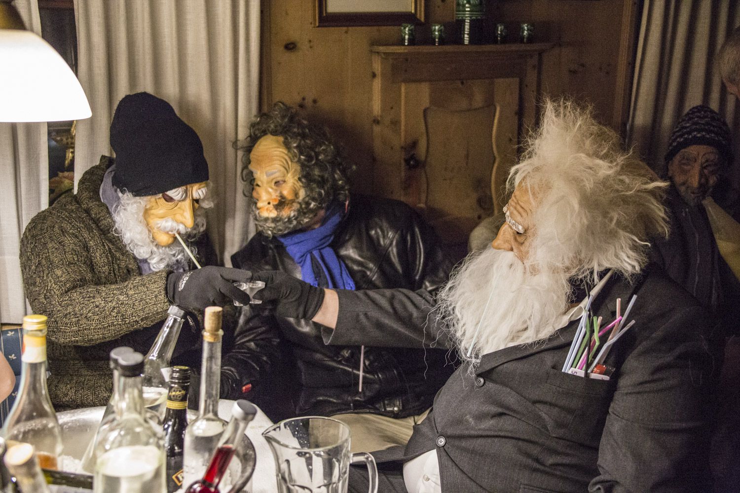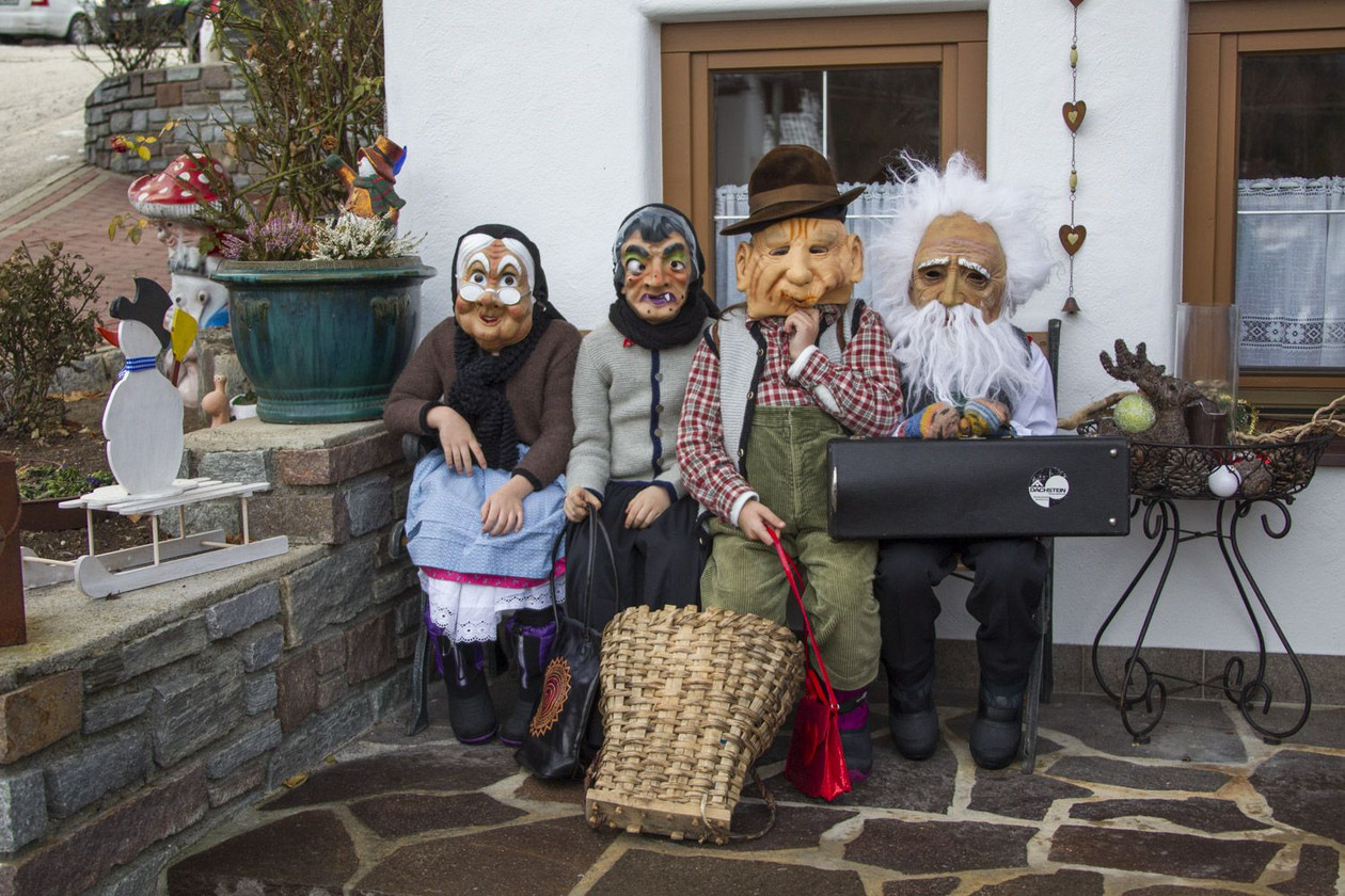 Ob nun die leichte Desorientierung der geringen Sicht durch die kleinen Augenschlitzen zu zollen ist oder eins, zwei, drei Gläschen Schnaps zu viel, das lässt sich zu diesem Zeitpunkt noch nicht genau sagen. Unverhohlen folge ich den fünf Gestalten über den Dorfplatz und amüsiere mich über die piepsigen Stimmen mit denen sie sich sogar untereinander unterhalten. Dann ertönt, ganz eindeutig, eine Männerstimme, die durch die Plastikmaske der Gruppe eine neue Koordinate erteilt: „Manda, mia gian ins Kasermandl“ (Männer, wir gehen jetzt zum „Kasermandl“)! Dafür erntet die soeben als männliches Wesen entlarvte Person einen beherzten Stoß in die Rippen. Dieser war ein klares Signal, ein Zivilist hört mit und wie mit Lachgas infiltriert schraubt sich die Stimme in ein helles Piepsen.