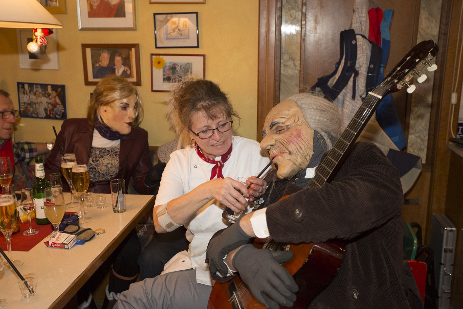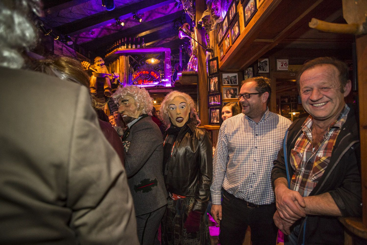 Die schnelle Reaktion lässt vermuten, dass das Torkeln doch durch die zu kleinen Augenschlitze der Gummimasken verursacht wird. Die Gruppe hat es nun eilig und läuft die tief verschneite Gasse zum Kasermandl (Lokal und Bar in Vorderlanersbach) hinauf. Schwungvoll geht die Türe auf, bevor die ankommende Gruppe auch nur den Knauf in die Hand genommen hat.