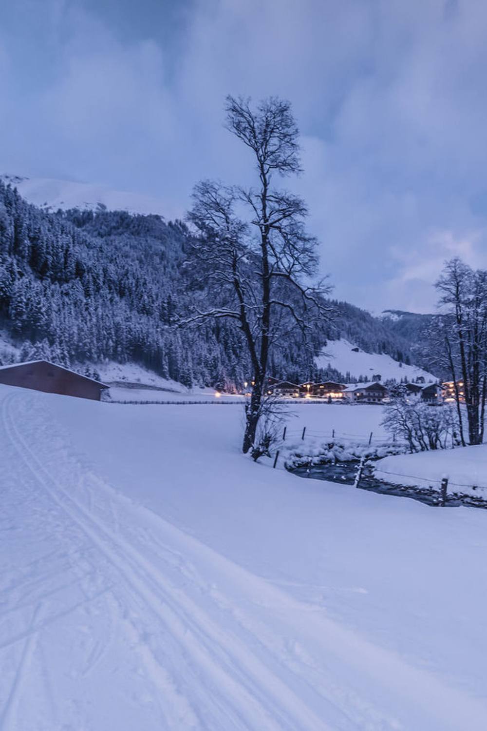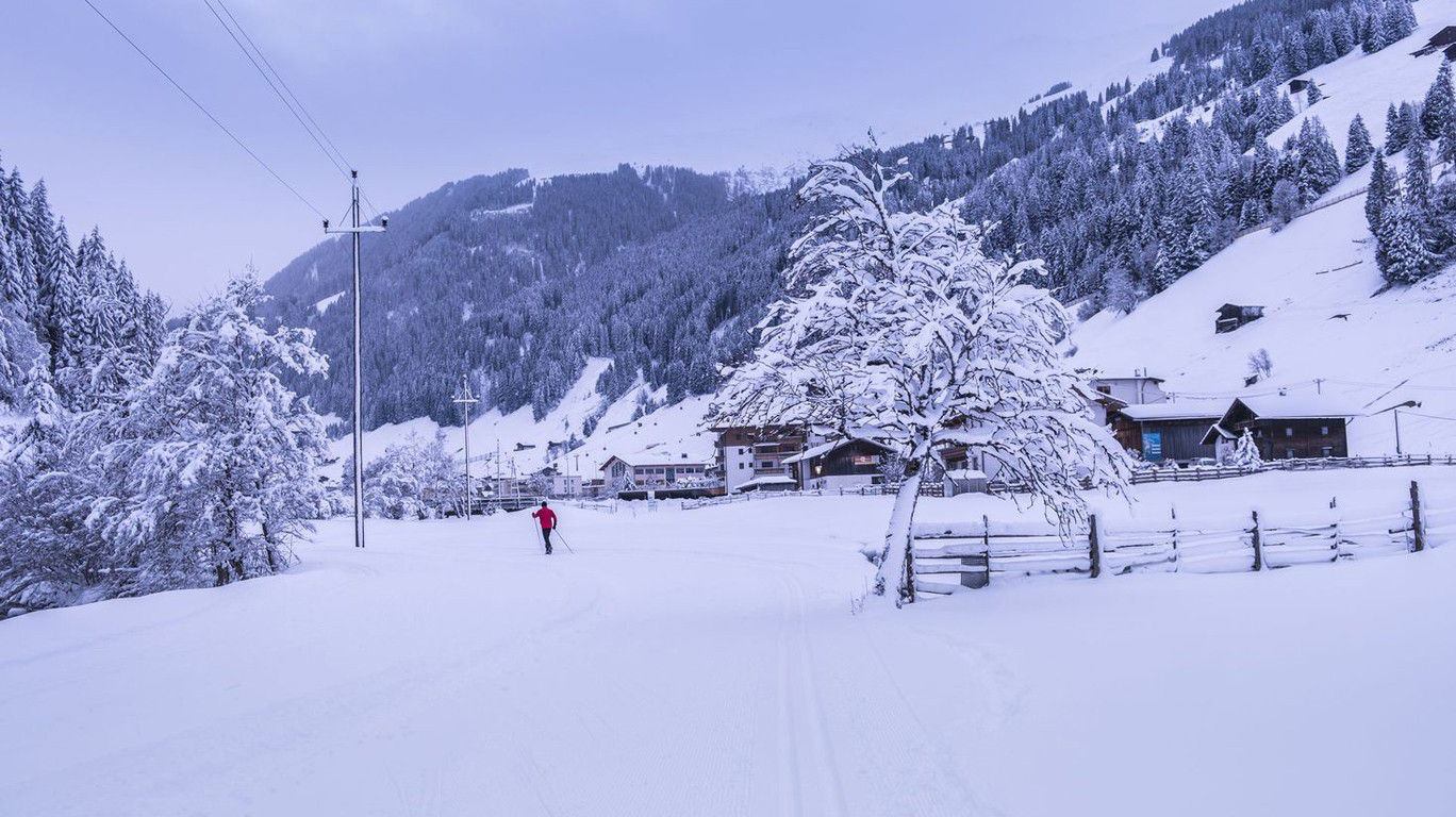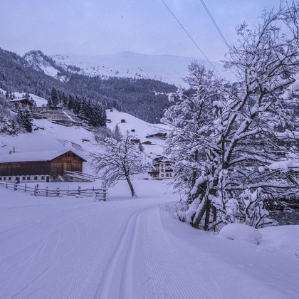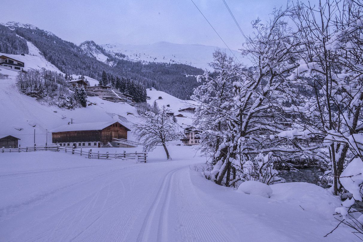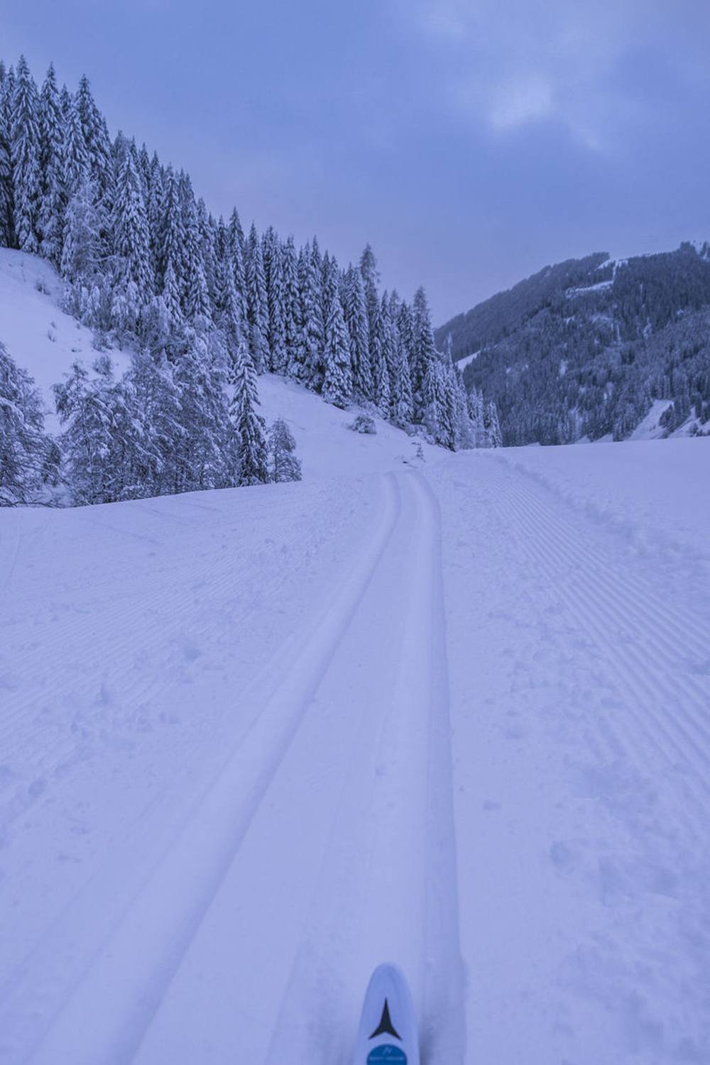 Während das inmitten einer Großstadt nicht gar so einfach ist, wissen die Bewohner des Tuxertals sehr wohl um den Luxus den sie alle direkt vor der Haustüre haben. Die 14 Kilometer lange „Luggi-Gredler-Loipe“ verbindet das Hochtal von Vorderlanersbach bis Madseit, den letzten Ortsteil vor Hintertux und dem Hintertuxer Gletscher. Auf dem zumeist schmalen Talboden verläuft die Loipe mittig zwischen Winterwanderweg und Häusern, Hotels, Schule, Eislaufplatz und Tux- Center. Die Ausrede „zu weit entfernt“ gilt hier also auf keinen Fall. Vom finnischen Gast bis hin zum Direktor der Neuen Mittelschule Tux treffe ich eine Menge Menschen auf der Loipe. Manche machen es recht gemütlich und nehmen die Chance auf einen kleinen „Loipen-Plausch“ gerne an, andere schießen mit professionellen Schwüngen auf der Skatingspur an mir vorbei.