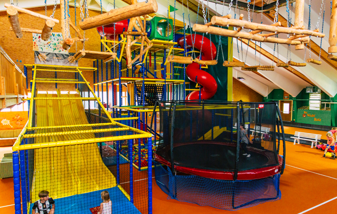 - Der coole Indoor-Bereich mit Trampolin, Kletterpark, Hochseilgarten, Spielecke uvm. verspricht (nicht nur) bei Regenwetter einen tollen Spieletag.
