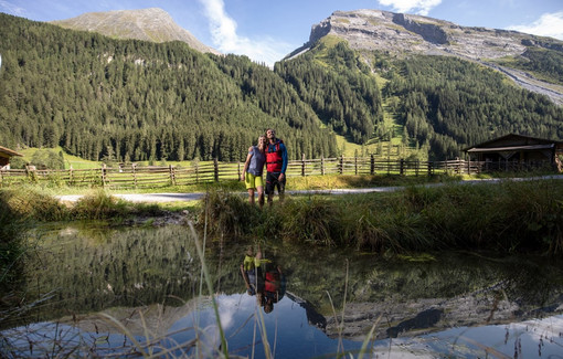 Tourenbeschreibung: Wanderweg Nr. 11 beginnt am Parkplatz vor der Talstation rechts. Ein Stück am Bach entlang, leichter Anstieg, flach oberhalb von Hintertux auf dem Feldweg weiter, durch den Tunnel gehen und beim Alpenbad Hotel Hohenhaus bis zum Ortskern von Hintertux absteigen. Unterhalb des Thermal-Badhotels Kirchler (765) führt Weg Nr. 10 (Badweg) am Tuxbach entlang zurück zum Ausgangspunkt.