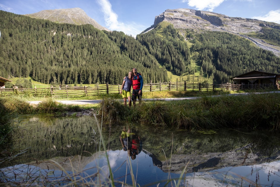 Tourenbeschreibung: Nach der Brücke links bergan auf der Zufahrtsstraße bis zum Haus Nr. 509 gehen. Ab dort auf der Schotterstraße (Weg Nr. 28) weiter, bis der alte Saumpfad den Weg kreuzt. Insgesamt dauert die Tour bis zur Höllensteinhütte (1740 m) etwa 1,5 Stunden. Auf dem breiten Almweg bleiben. 900 m nach der großzügigen Kehre zweigt der Wanderpfad links durch den Wald hinauf aufs Tapeneck (1830 m) ab. Am idyllischen kleinen Griersee vorbei, schon ist die Grieralm in Sicht. Von der Hütte führt der gut markierte Weg Nr. 22 über die Tulferalm (1700 m) hinunter nach Madseit. Entweder über die Hängebrücke und dann rechts talauswärts oder am Waldrand entlang bis zum Nösslauhof (708) und dann auf Weg Nr. 12 zur Bushaltestelle gehen.